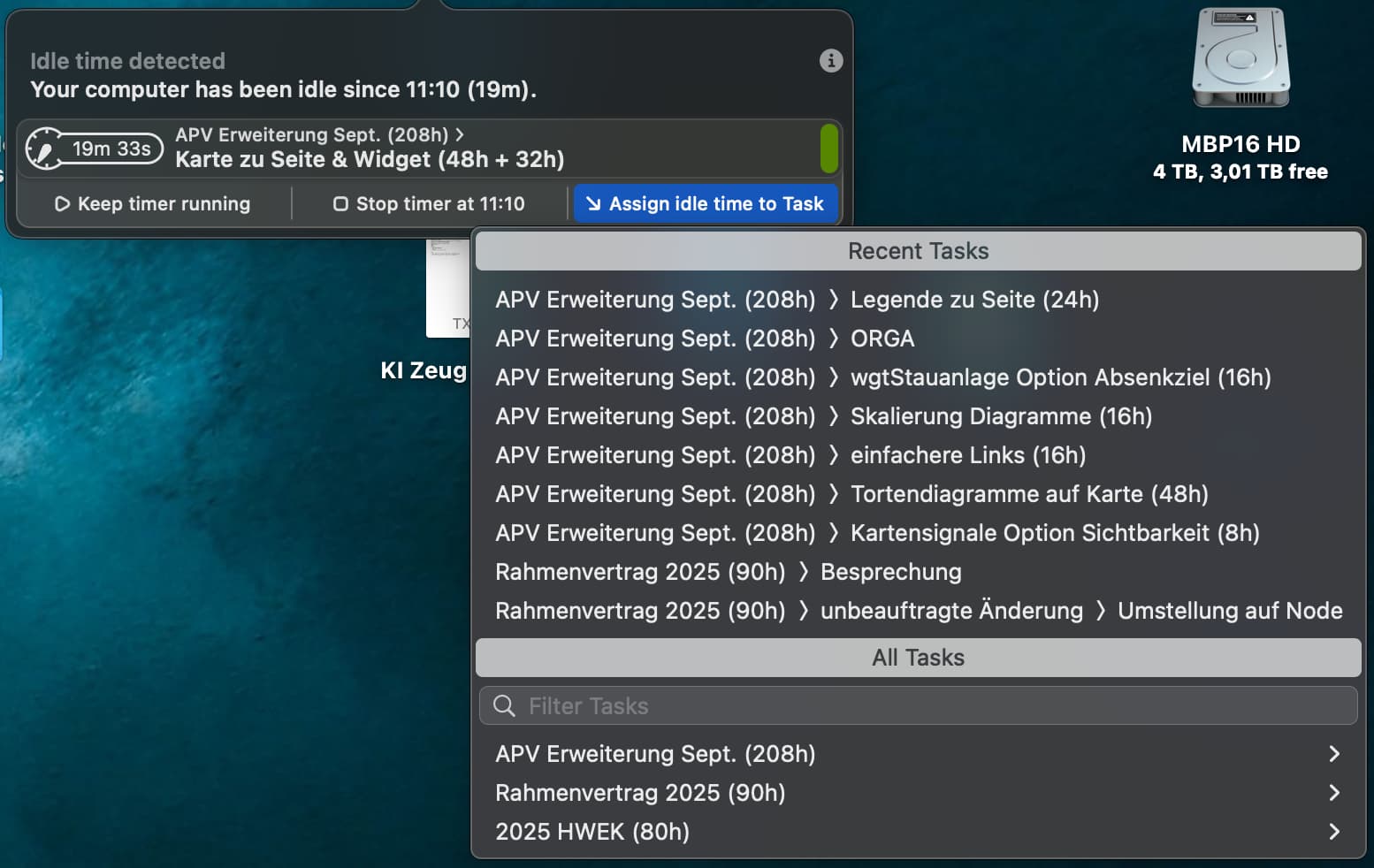 So for me it would be the easiest to have a button “Assign idle time to current task” to have only one click. But it would also be ok to have the current task on top of the “Recent Tasks” list (two clicks then). :o)