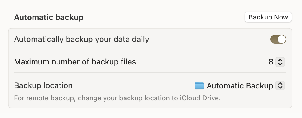 I have tried Timelime backup and I guess I never activated automatic backup. Time Machine seems to work, but no old data appears. The Main Window shows only March 2026 and no data ,although I checked in and out in different tasks.